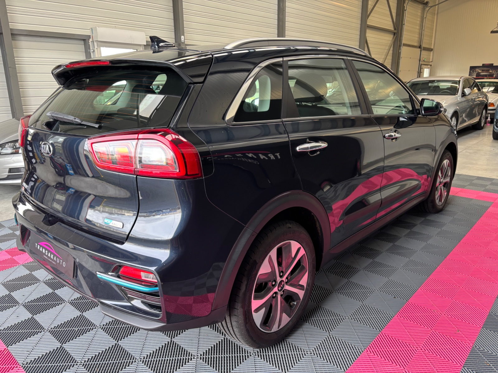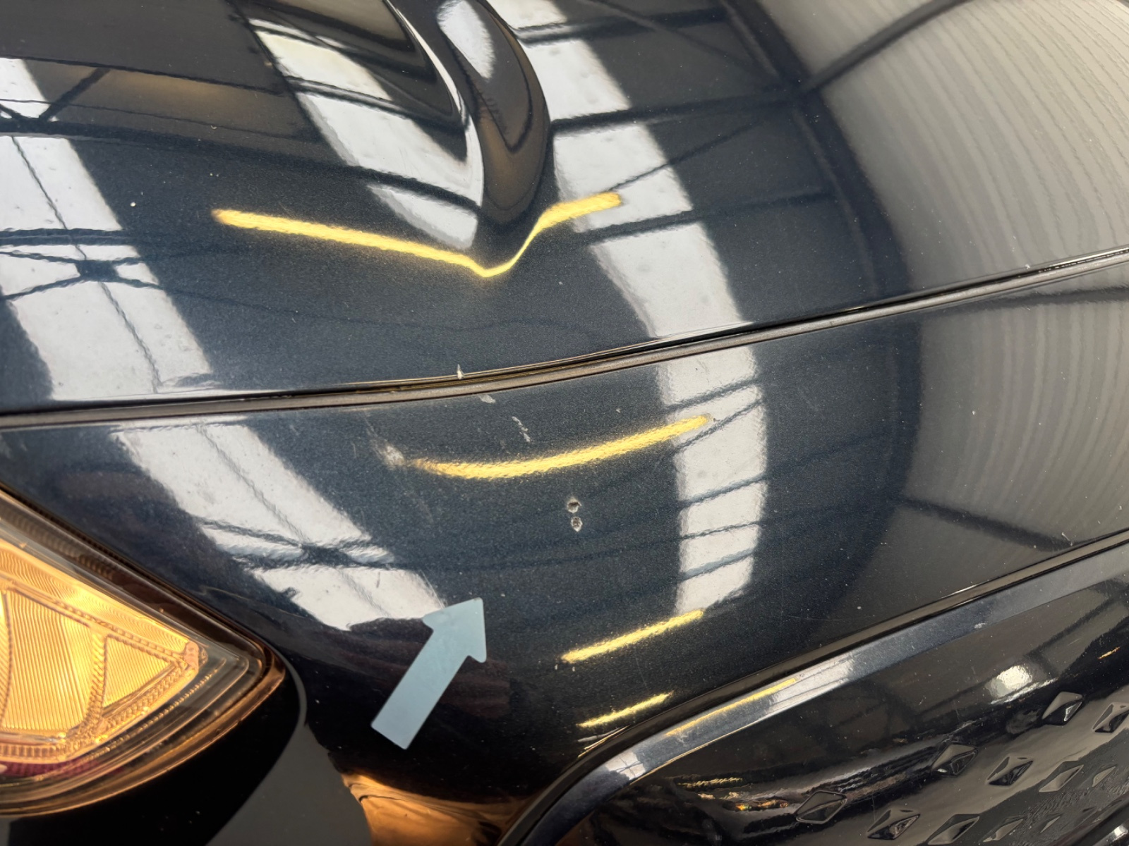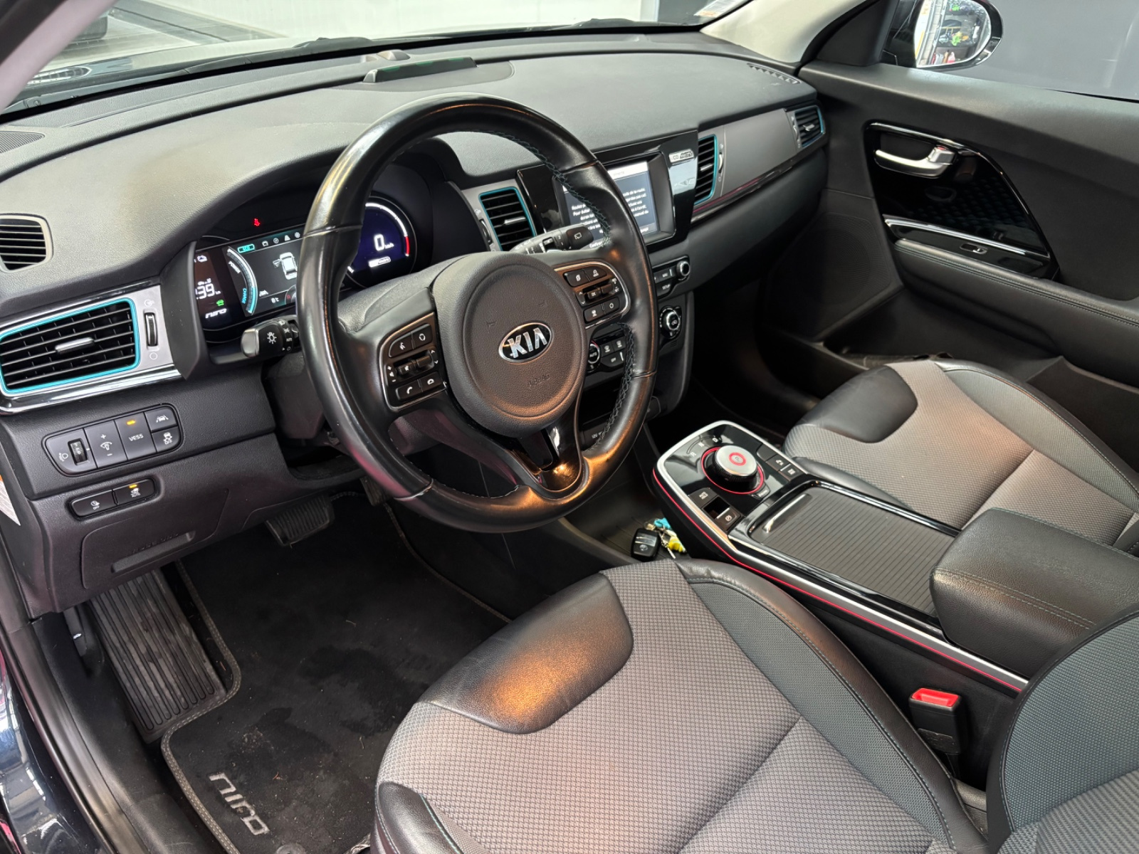 Inserts noir laqué sur console centrale, contre-portes, sérigraphie bleu anodisé sur le volant